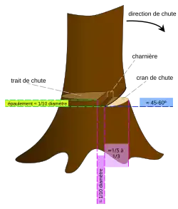 La chute s'obtient par le trait de chute ou trait d’abattage à l’opposé du cran de chute et un peu plus haut que son plancher, une charnière se formant ainsi dans les derniers instants et participant au contrôle de la chute en direction et du déplacement horizontal du tronc.