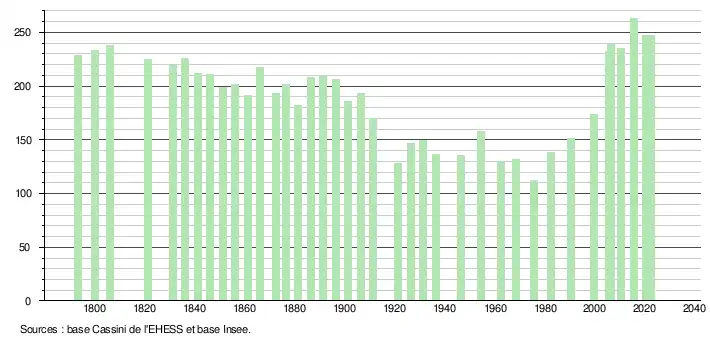 L'évolution du nombre d'habitants est connue à travers les recensements de la population effectués dans la commune depuis 1793. Pour les communes de moins de 10 000 habitants, une enquête de recensement portant sur toute la population est réalisée tous les cinq ans, les populations de référence des années intermédiaires étant quant à elles estimées par interpolation ou extrapolation[13]. Pour la commune, le premier recensement exhaustif entrant dans le cadre du nouveau dispositif a été réalisé en 2005[14].