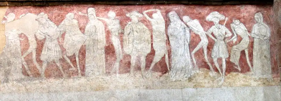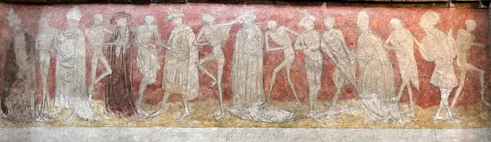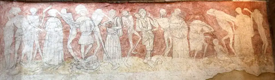 Dans le bas-côté gauche du chœur se trouve une peinture murale de la danse macabre réalisée sur trois panneaux. D'une longueur totale de 26 mètres, cette fresque a été faite au XVe siècle probablement au cours ou à la fin d'une épidémie de peste noire. Les personnages représentés sont des religieux ou des laïcs, en alternance desquels figure la mort peinte sous la forme non pas d'un squelette, mais d'un personnage avec la peau sur les os appelé transi.