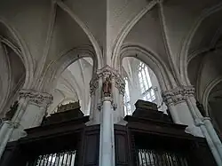 Les voûtes reposent sur des piliers cylindriques avec quatre colonnes engagées. La décoration des nervures, des clefs de voûte et des chapiteaux est faite d’une profusion de feuillage enroulé où l’on distingue, varech, feuilles d’érable, de vigne, de houblon, de chêne, de chardon etc.