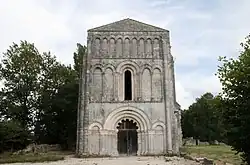 Son portail polylobé exceptionnel s'ouvre entre deux étroites arcatures aveugles. Les voussures sont nues, mais les archivoltes et les chapiteaux sont sculptés de rinceaux minces entrelacés.
