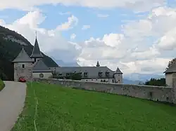 Abbaye de Tamié depuis la route du col, en arrière-plan la Sambuy.- Abbaye Notre-Dame de Tamié.