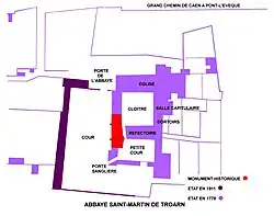 Au sud du grand chemin de Caen à Pont-l'Évêque, on accède à la grande porte d'entrée par une grande place d'où l'on descend à l'église. De la grande porte on entre dans la cour commune avec le logement du portier, les écuries, l'aumônerie, la grange et le pressoir, les maisons du prieur et des abbés. La porte sanglière donne sur la petite cour avec le chartrier et l'infirmerie.
