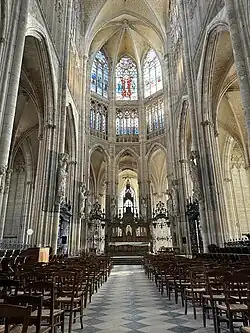 Le chœur et le chevet pentagonal avec ses onze chapelles[14], visibles du jardin de l'hôtel de ville, est une merveille d'harmonie et d'équilibre, tout en style gothique rayonnant, à l'exception de la partie nord du chœur contre laquelle subsiste une absidiole romane, dite « tour aux Clercs », vestige de la grande abbatiale antérieure. Le chœur est fermé par des grilles forgées en 1740/1749 par Nicolas Flambart. Au-dessus des grandes arcades, sous le triforium, subsistent des peintures murales du XIVe siècle. Le maître-autel en laiton doré est une réalisation de l'architecte Sauvageot, exécutée par l'atelier Poussielgue-Rusand en 1885.