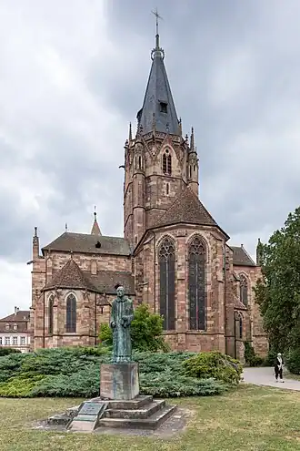 Plus vaste église gothique[4] d'Alsace après la cathédrale de Strasbourg, l'abbatiale a été construite de 1265 à 1284 à l'emplacement d'un premier édifice du début du XIe siècle dont il reste le clocher roman à l'ouest.