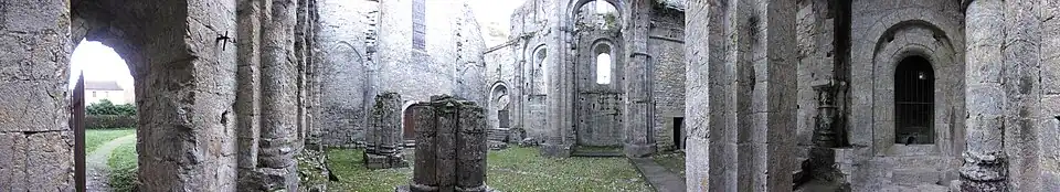 - Un ensemble des XIe et XIIe siècles. Le portail sud est orné d’un tympan daté vers 1100. Il présente un Jugement dernier avec le Christ en majesté entre le soleil et la lune, les anges portant les instruments de la passion, Pierre et Paul. L’ancienne nef romane est à ciel ouvert. De puissants piliers conservent leurs arcs dénudés et leurs chapiteaux sculptés. Dans le prolongement du croisillon nord, la salle capitulaire datée de 1125 environ présente des chapiteaux historiés dans les baies ogivales.