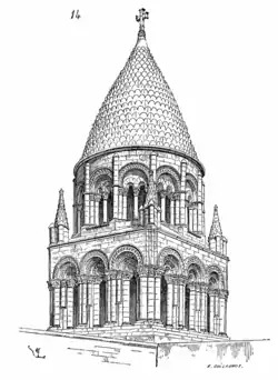 Le couronnement du clocher, formé d'une flèche à écaille dite « en pomme de pin » s'inspire des monuments funéraires de l'Antiquité.