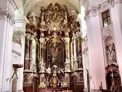 L'église abbatiale (construite entre 1754 et 1764) est une église de style rococo. Elle est surmontée d'une tour de 76 mètres.