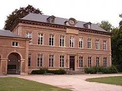 L'ancien « bâtiment des hôtes » de l'abbaye, derrière lequel on voit le clocher de l'église Saint-Denis. | |