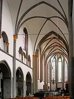 C'est entre 1228 et 1239 que la nef de l’abbaye prit sa forme définitive. La reconstruction commença par les collatéraux et se fit d’ouest en est jusqu’au transept, mais le voûtement de la nef centrale dut être repoussé (il ne devait intervenir qu'au XVe siècle). Il fallut même renoncer à imiter le plan trifolié inspiré par la cathédrale de Cologne. Les puissants piliers en faisceau de la croisée d'ogive du transept trahissent cette intention avortée.
