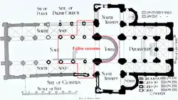 Le plan bénédictin de l'église est proche de celui de l'église Saint-Nicolas de Caen fille aînée de l'abbatiale Saint-Étienne de Caen. On y retrouve l'élévation à trois niveaux, la coursive ou mur normand dans les fenêtres hautes, même dans la partie gothique de la nef ce qui est unique en Angleterre. Seul le chevet plat est anglais.