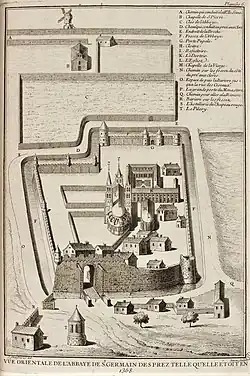 Le creusement de douves nécessita d'ailleurs à l'époque l'achat par les religieux d'une partie du Pré-aux-Clerc à l'Université qui reçut en échange le terrain mitoyen situé au nord l'abbaye que l'on appela « Petit Pré-aux-Clerc » (la partie principale étant alors désignée sous le nom de « Grand Pré-aux-Clerc »).