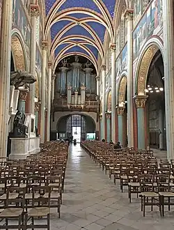 En 1919, Eugène Lefèvre-Pontalis écrit au sujet des peintures de Flandrin : « En 1843, Hippolyte Flandrin commença par le chœur la série de ses peintures justement célèbres où les scènes de l'Ancien Testament annoncent celles de la vie du Christ : son œuvre s'acheva dans la nef peinte de 1856 à 1861. Mal éclairées et noircies par la poussière, ces fresques d'un si doux coloris et d'une très grande valeur artistique auraient été mieux placées dans une église moins obscure, mais ce qui fut désastreux c'est l'ornementation dessinée par Denuelle et jugée nécessaire pour les encadrer. Étoiles d'or sur voûtes d'azur, dorure des chapiteaux neufs de la nef et des chapiteaux romans du sanctuaire, peinturlurage des colonnes et des murs, rien ne fut épargné pour dénaturer les lignes de l'architecture. Seul le déambulatoire et ses chapelles échappèrent au pinceau des décorateurs »[41].