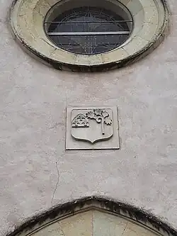 Un blason, reproduisant les armes des abbesses de jadis, est situé au-dessus de la porte de l'église paroissiale de la commune. Il est marqué des armes de la famille de France afin d’affirmer la fondation royale de l’abbaye. Ces fleurs de lys sont associées à une crosse en dedans ornée de feuilles, peut-être de houx ou de chêne vert[40],[41].