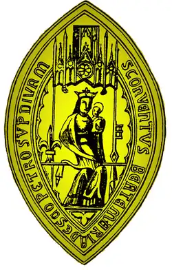 Les armoiries de l'abbaye de Saint-Pierre-sur-Dives : D'azur à trois fleurs de lys, 2 et 1, et un lambel de trois pendants, de gueules, en chef, chaque pendant chargé d'une tour d'or[17].
