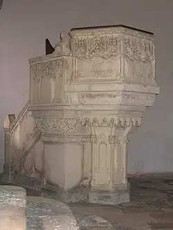 L'église abrite un maître autel en bois sculpté, du XVIe siècle[1], dont les panneaux représentent les scènes de la nativité provenant de Coutances, ainsi qu'une chaire, œuvre inachevée de Halley qui sera déplacée lors de la restauration de l'édifice à la suite des dommages de . Elle se trouve actuellement au bas de la nef latérale nord, à gauche en entrant.