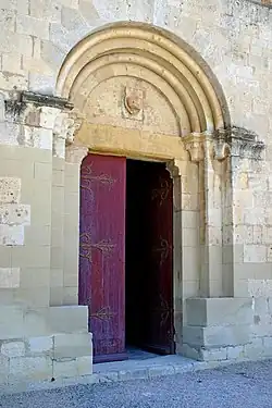 La partie centrale de la façade est percée d'un portail en plein cintre à triple voussures dont l'archivolte est ornée de deux arcs toriques (boudins) reposant sur des chapiteaux encadrés de chapiteaux à feuilles d'eau, motif typique de l'architecture cistercienne que l'on retrouve à l'intérieur de l'abbatiale. Le tympan aveugle repose sur un puissant linteau.