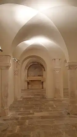 Sous le presbytère de l'église abbatiale se trouve la crypte médiévale à plan irrégulier, avec des voûtes d'arêtes, soutenues par des colonnes surmontées de chapiteaux originaux décorés de motifs géométriques. Dans une petite pièce le long du mur court un banc de pierre d'où partent sept petites colonnes, se rejoignant au centre de la coupole. Dans une niche, se trouve une peinture du XIVe siècle représentant Saint Pierre Célestin distribuant la règle.
