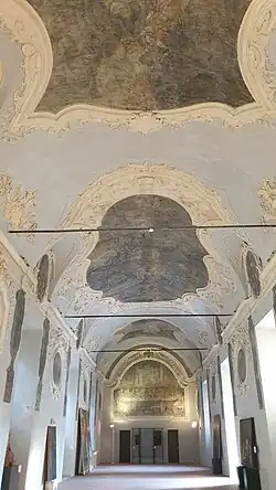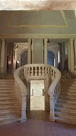 Le portail de la façade est l'œuvre de Catterino di Rainaldi de Pescocostanzo[7], il est en plein cintre, encadré par un encadrement trapézoïdal fait de rangées de pierres lisses et bosselées, et flanqué de deux piliers composés de tronçons cylindriques et parallélépipédiques, dont les chapiteaux servent de consoles pour le balcon supérieur, où s'ouvre une fenêtre rectangulaire avec un cadre mouluré et un fronton courbe brisé. L'atrium est décoré d'une perspective en trompe-l'œil avec des portraits des souverains napolitains, peints en monochrome au XVIIIe siècle par le moine Joseph-Martinez Cinto.