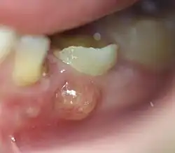 Signes cliniques : gonflement localisé (voussure) ; la gencive est rouge, lisse, vernissée (signes de l'inflammation). Du pus s'évacue à la pression. La dent peut être mobile ; elle peut même migrer. La douleur est variable, de modérée à sévère.