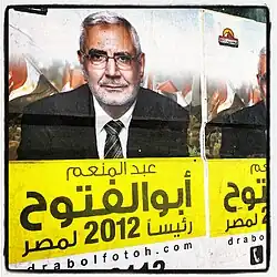 Le de la même année, il s'est déclaré candidat à l'élection présidentielle, ce qui lui a valu d'être exclu du mouvement des Frères musulmans, qui avait décidé dès le mois de février de ne présenter aucun de ses membres à ce scrutin[8]. Aboul Fotouh est par conséquent un candidat « indépendant ». Islamiste modéré, celui que certains appellent « l’Erdoğan égyptien »[8] est par exemple opposé à l'imposition du voile islamique aux femmes[8] ou à la mise en place d'une taxe zakât obligatoire et gérée par l'Etat (sur le modèle de l'Arabie saoudite, du Pakistan et de la Malaisie). Il se veut le représentant des « jeunes Frères musulmans », c'est-à-dire des Frères musulmans qui ont pris une part active aux côtés des jeunes libéraux à la révolution de 2011.