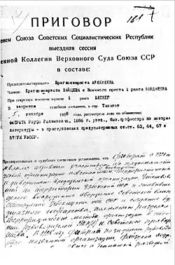 Soupçonné d'être membre d'une organisation nationaliste contre-révolutionnaire, Abdurrauf Fitrat est accusé d'avoir essayé de recruter de jeunes écrivains pour ses idées, d'avoir compilé des textes dans l'esprit du nationalisme contre-révolutionnaire et d'avoir lutté pour la séparation d'un État turc bourgeois de l'Union soviétique. Il est poursuivi comme "l'un des fondateurs et dirigeants du jadidisme nationaliste contre-révolutionnaire" et comme organisateur d'un "mouvement nationaliste pan-turc contre-révolutionnaire contre le parti et le gouvernement soviétique" selon les articles 67 et 66 (1) du code pénal de la RSS d'Ouzbékistan[34]. Selon des dossiers secrets, il a craqué pendant l'interrogatoire et admet l'ensemble des crimes idéologiques dont on l'accuse[35].