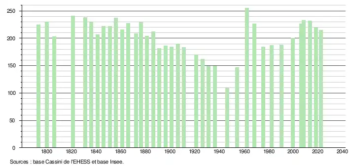 - ↑ Fiches Insee - Populations de référence de la commune pour les années 2006, 2007, 2008, 2009, 2010, 2011, 2012, 2013, 2014, 2015, 2016, 2017, 2018, 2019, 2020, 2021 et 2022.