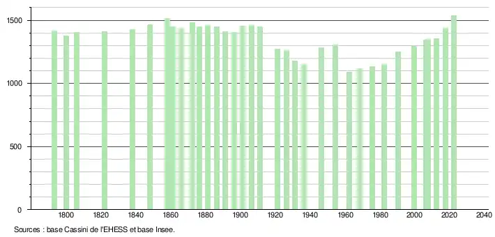 L'évolution du nombre d'habitants est connue à travers les recensements de la population effectués dans la commune depuis 1793. Pour les communes de moins de 10 000 habitants, une enquête de recensement portant sur toute la population est réalisée tous les cinq ans, les populations de référence des années intermédiaires étant quant à elles estimées par interpolation ou extrapolation[21]. Pour la commune, le premier recensement exhaustif entrant dans le cadre du nouveau dispositif a été réalisé en 2007[22].