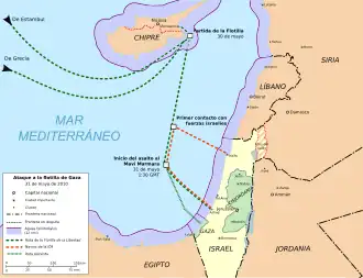 Le convoi appareille de Chypre le en fin d’après-midi, sans tenir compte de la proposition israélienne d’accoster dans le port d’Ashdod afin qu’Israël transfère la cargaison, après vérification, par voie terrestre[28],[29],[30].