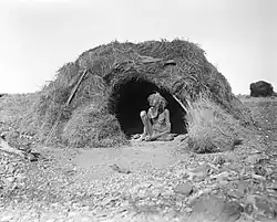 Un homme Arrernte du Territoire du Nord et une hutte traditionnelle en 1920.