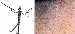 Motif 1 : anthropomorphe debout marchant vers la droite, tête d'aspect globulaire, de la partie supérieure de laquelle dépassent deux épis verticaux (antennes, plumes) en guise d'élément ornemental. Corps stylisé, le torse élargi à hauteur d'épaule, le bras droit fléchi : il porte deux éléments courbes réunis au sommet, les extrémités tournées vers l'extérieur, compatibles avec les armes de jet (boomerangs). Le bras gauche fléchissait et montait également, avec un objet linéaire et fin, comme une lance. La jambe droite est légèrement en avant, formant un angle aigu par rapport au membre gauche, qui se situe verticalement dans le développement du corps.