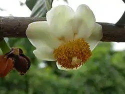 Mammea americana est une dicotylédone de la famille des Calophyllacées[3] des régions tropicales d'Amérique. Certains individus ne portent que des fleurs mâles et sont donc improductifs, et d'autres des fleurs hermaphrodites, fonctionnellement femelles (androdioecie cryptique).