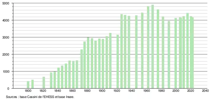 L'évolution du nombre d'habitants est connue à travers les recensements de la population effectués dans la commune depuis 1800. Pour les communes de moins de 10 000 habitants, une enquête de recensement portant sur toute la population est réalisée tous les cinq ans, les populations de référence des années intermédiaires étant quant à elles estimées par interpolation ou extrapolation[31]. Pour la commune, le premier recensement exhaustif entrant dans le cadre du nouveau dispositif a été réalisé en 2005[32].