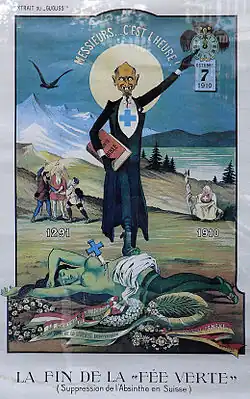En Suisse, le , Lanfray, un ouvrier viticole, tue femme et enfants après s'être saoulé à l'absinthe. L'affaire provoque une émotion considérable, attisée par les producteurs de vin romands qui trouvent ici le prétexte parfait pour demander l'interdiction de l'absinthe par votation populaire. Le , le peuple suisse vote sa pénalisation (63,5 % des votants), interdisant « la fabrication, l'importation, le transport, la vente, la détention pour la vente de la liqueur dite absinthe dans toute l'étendue de la Confédération ». Au moment de l'interdiction, le Val-de-Travers, berceau de l'absinthe, compte 14 distilleries, 200 employés et plus de 300 000 m2 de cultures d'absinthes[22].
