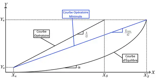 En reprenant le bilan de masse global, il est possible d'exprimer , c'est-à-dire la courbe d'équilibre tenant compte des non-idéalités du phénomène d'absorption. À l'équilibre, . De fait,