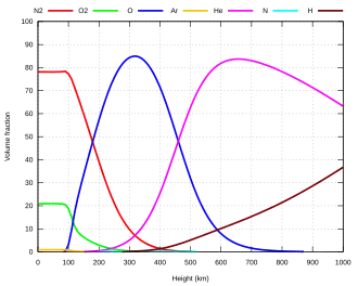 À haute altitude azote et oxygène sont dissociés par le rayonnement solaire, l'hélium et l'hydrogène augmentent avec l'altitude (voir figure). On utilise pour les données le modèle MSIS ( Mass Spectrometer and Incoherent Scatter radar) du Naval Research Laboratory[2].