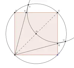 - On peut alors prouver que les droites (AU) et (AV) coupent le carré en deux points qui sont les points E et F recherchés.