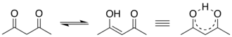 Les formes tautomères énol et cétone de l'acétylacétone coexistent en solution, comme montré figure 1. La symétrie C2v de la forme énol (forme à droite pour l'équilibre décrit figure 1) a été observée via différentes méthodes incluant la spectroscopie micro-ondes[6]. La liaison hydrogène de l'énol réduit la répulsion stérique entre les deux groupes carbonyles. La constante d'équilibre K entre les deux formes tautomères est de 11,3 en phase gazeuse. Cette constante tend à croître dans les solvants apolaires : dans le cyclohexane : 42; dans le toluène : 10; dans le THF : 7,2; diméthylsulfoxyde : 2; et dans l'eau : 0,23[7].
