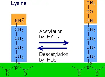 L’acétylation caractérise une modification post-traductionnelle catalysée par des acétyltransférases (Exemples : la CREB-binding protein (CBP) - [CREB : "cAMP response element binding protein"] et la protéine p300 qui agissent sur les histones.) qui consiste en l'ajout de groupe fonctionnel acétyle COCH3[1] dans une molécule. L'acétylation de résidus de lysine à l'extrémité N-Terminale d'une protéine histone neutralise les charges positives et modifie la taille de la chaine latérale du résidu, ce qui induit un changement de conformation des protéines modifiées et le mode d'interaction avec leurs molécules cibles, en particulier l'ADN qui est chargé négativement. Autrement dit, l'acétylation des lysines réduit l'affinité "histone/ADN". Ceci favorise l'accès de la région promotrice du gène à l'ARN polymérase et aux facteurs de transcription. L'acétylation des histones est une modification réversible et favorise la transcription tandis que le clivage (désacétylation), catalysée par des déacétylases, de ces mêmes histones l'inhibe.