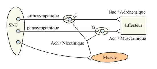 Ach : Acétylcholine, G : Ganglions, Nad : Noradrénaline, SNC : Système nerveux central.