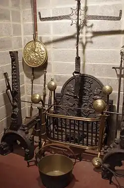 - porte-instruments ou serviteur - supporte tisonnier, brosse, balayette et pelle à cendres, pince à braises et soufflet à bouche.