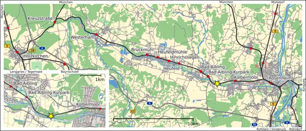 - ↑ « Fahrplan Mangfalltalbahn : Zug 79505, Abfahrt Bad Aibling 06:40 Uhr, Zug 79506, Abfahrt Kolbermoor 06:45 Uhr, planmäßiger Treffpunkt um 06:44 in Kolbermoor » [PDF], der-meridian.de (consulté le )