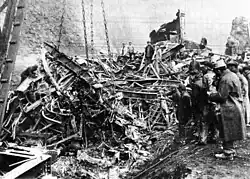 Photographie prise pendant les opérations de déblaiement montrant les débris des voitures du train accidenté.