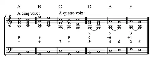 - On note dans ce chiffrage, qu'en vertu de la règle obligeant la neuvième à se trouver au-dessus de la sensible, l'ordre des chiffres représentant les deux notes en question — « +6 » et « 5 » — rappelle la disposition obligatoire.