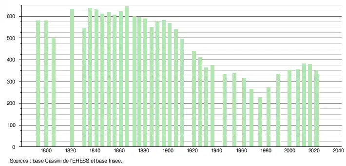 L'évolution du nombre d'habitants est connue à travers les recensements de la population effectués dans la commune depuis 1793. Pour les communes de moins de 10 000 habitants, une enquête de recensement portant sur toute la population est réalisée tous les cinq ans, les populations de référence des années intermédiaires étant quant à elles estimées par interpolation ou extrapolation[19]. Pour la commune, le premier recensement exhaustif entrant dans le cadre du nouveau dispositif a été réalisé en 2006[20].