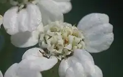 Comme tous les membres de la famille des Astéracées, les « fleurs » sont en fait des capitules de 5 mm de diamètre souvent blanches, roses ou pourpres sur les bords (fleurons ligulés zygomorphes), alors que les fleurons du centre (fleurons tubulés actinomorphes) sont blanc-jaunâtre à jaunes. Ces capitules, qui apparaissent sur les réceptacles inflorescentiels aux sommets des tiges, forment des corymbes au sommet aplati ou un peu bombé[15].