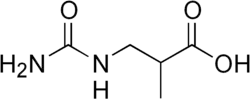 L’acide 3-uréidoisobutyrique, également appelé acide β-uréidoisobutyrique, est un intermédiaire métabolique de la dégradation de la thymine. Chez l'humain, elle s'accumule dans l'urine des patients souffrant d'un déficit en bêta-uréidopropionase[2] (EC ), ce qui permet de dépister les anomalies dans le métabolisme des pyrimidines et prévenir l'usage du 5-fluorouracile comme néoplasique lorsqu'il pourrait s'avérer gravement toxique pour l'organisme[3].