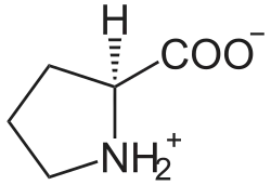 - ↑ La proline est un acide α-aminé dont l'amine est secondaire et dont la structure générale est par conséquent différente :