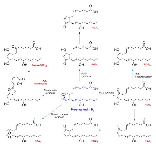 (en) voies métaboliques de la PGH2 vers la prostacycline, les prostaglandines et les thromboxanes.