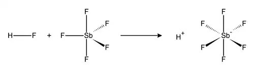 Le proton de l'ion H+ du système HF + SbF5 à 1:1 est presque totalement libre, ce qui explique son acidité extrême : l'acide fluoroantimonique HSbF6 est 2 × 1019 fois plus fort que l'acide sulfurique H2SO4 à 100 %.